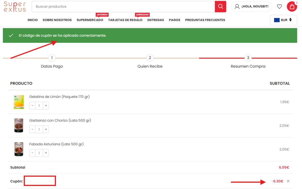 Una vez que cuente con su cupón, debe agregar al carrito los productos que desee comprar y aplicar el cupón como se muestra en la imagen.